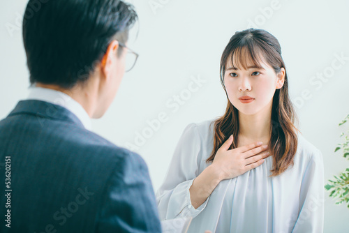 interview, woman, job hunting, chair, seated, sit down, business, white background, earnest, stress, employee, recruit, greeting, copy space, frame, houseplant, work, portrait, work, glasses, office, waist up, indoor, japanese, people, asian, temp, refreshing, waist, long hair, relax, casual, lifestyle