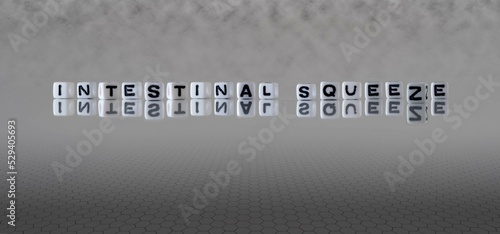 intestinal squeeze word or concept represented by black and white letter cubes on a grey horizon background stretching to infinity