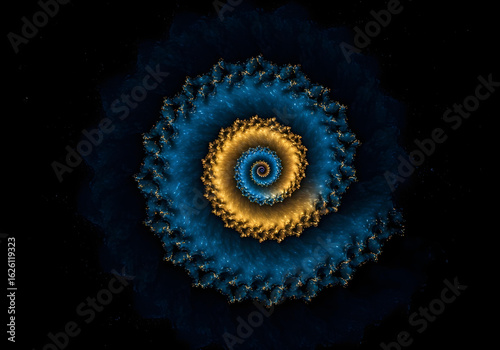 Intricate abstract spiral design with deep blue and shimmering gold hues, reminiscent of a galaxy, against a black velvet background, vibrant studio lighting, with a focus on texture and depth.