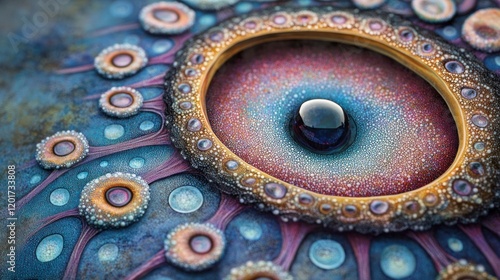 Intricate Biomorphic Design with Central Eye-like Structure and Concentric Rings in Vibrant Hues