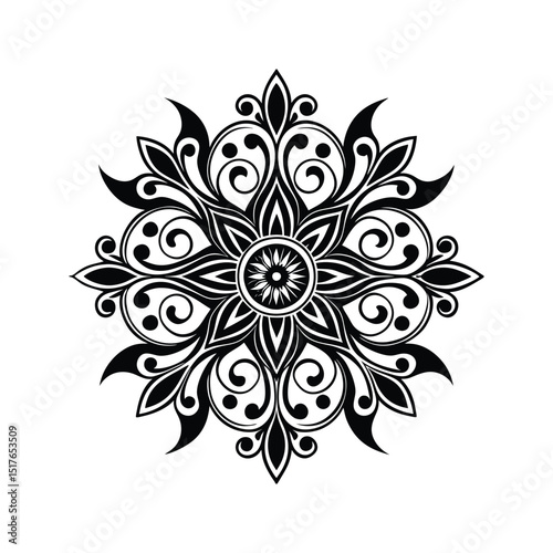 Intricate black and white floral mandala design with decorative ornamental swirls and flourishes