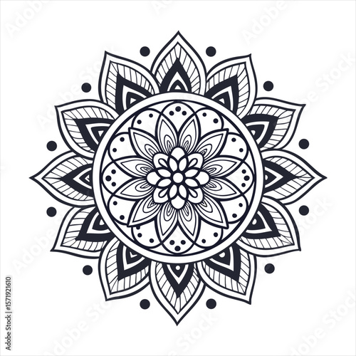 Intricate black and white mandala design with floral petals and geometric patterns