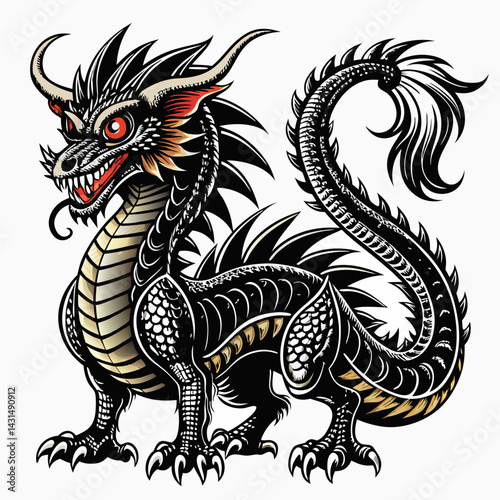 dragon, black, red, traditional, scale, detailed, mythical, fantasy, art, drawing, creature, beast, horn, tail, claw, fierce, eye, tattoo, symbol, ornate, asian, culture, decorative, animal, reptile, legendary, graphic, vibrant, folklore, guardian, powerful, fearsome, majestic, supernatural, mythical, chinese, japanese, unique