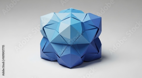 paper, sculpture, origami, polyhedron, object, shape, form, geometry, art, craft, design, model, structure, figure, artwork, blue, geometric, faceted, triangular, polygonal, complex, intricate, precise, sharp, clean, minimalist, modern, abstract, three-dimensional, three-dimensional, surface, texture, fold, crease, edge, line, angle, light, dark, monochrome, gradient, cyan, cobalt, studio, isolated, background