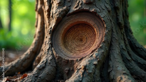 Intricate Circular Pattern in a Tree Trunk's Bark, Revealing Nature's Unique Sculptural Details and the Subtle Hues of Sunlight Filtering Through the Forest Canopy
