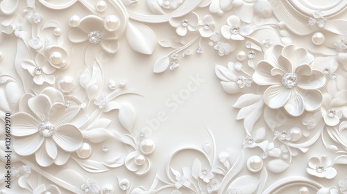 Intricate design features floral ornament with pearls and gems on a white backdrop, creating a luxurious 3D effect