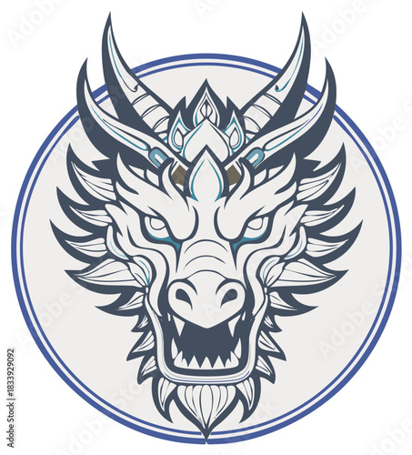 dragon, mythical, fantasy, illustration, vector, graphic design, logotype, emblem, symbol, icon, mascot, stylised, intricate, ornate, detailed, line art, traditional, power, strength, fierce, strong, aggressive, head, face, eye, horn, teeth, sharp, circular, border, creature, ancient, legend, legendary, beast, majestic, blue, white, graphic, artwork, drawing, oriental