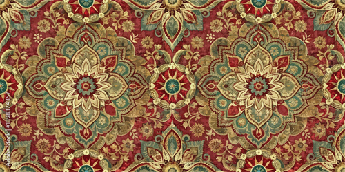 Intricate floral pattern in rich red, green, and gold tones, showcasing elegance.