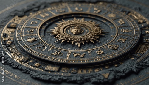 ornate, clock, zodiac, astrology, astronomy, circular, gold, dark, grey, stone, detailed, intricate, design, ancient, mystical, cosmic, celestial, time, symbol, constellations, luxury, elegant, texture, metal, relief, engraving, pattern, abstract, background, image, graphic, illustration, decorative, art, vintage, antique, craft, geometric, shape, line, three-dimensional, render, digital, closeup, detail, precision, symbolic, mysticism