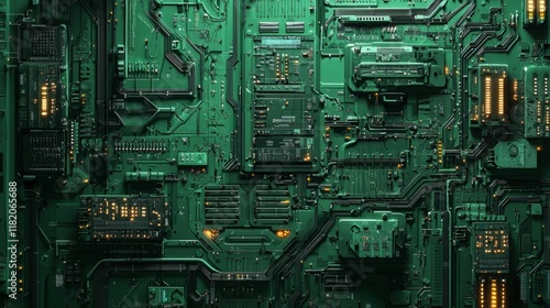 Intricate Green Circuit Board with Complex Connections and Illuminated Components in a Technological Wonderland