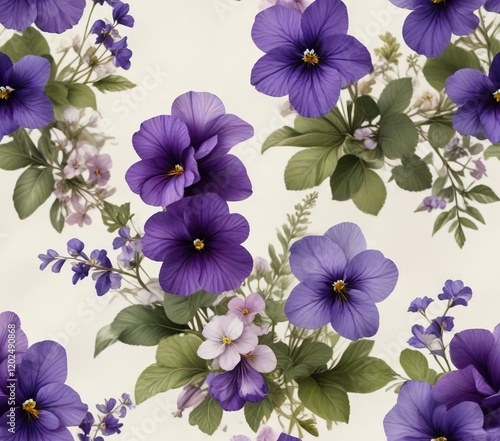 Intricate, hand-painted violets in various stages of bloom against a creamy white background, soft focus photography, intricate details