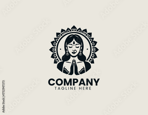Intricate Indian woman vector logo illustration performing traditional Namaste gesture with ornate details. Cultural design concept