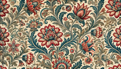 Intricate Kalamkari-Inspired Textile Pattern with Large Stylized Florals in Deep Reds and Greens – A Traditional Indian Design