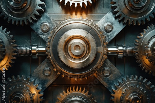 Intricate metal gears interlock, showcasing precision engineering and complex machinery.