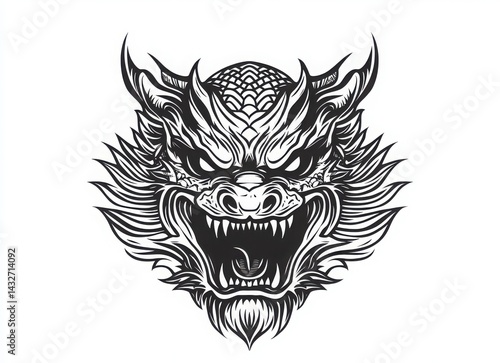 dragon, mythical, creature, head, monochrome, black, and, white, illustration, graphic, design, art, tattoo, japanese, chinese, beast, powerful, fierce, mythology, legend, ancient, fantasy, detailed, intricate, pattern, scale, teeth, claw, horn, angry, intense, sharp, symbol, power, strength, wisdom, mystery, culture, history, artwork, drawing, vignetting, vector, line, ink, background, isolated, close, up