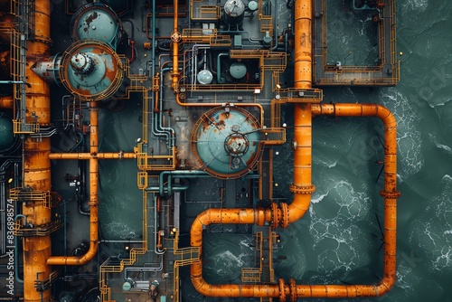 aerial, view, industrial, plant, intricate, orange, pipe, machinery, body, water, production, architecture, complexity, technology, mechanical, precision, manufacture, innovation, overhead, operation, facility, equipment, development, engineering, infrastructure