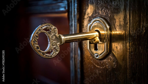 Intricate ornate golden key inserted into an antique wooden door lock. High-quality image perfect for concepts of security, mystery, access, and exclusivity.