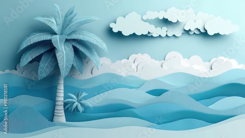 Intricate paper art illustration of a coconut tree with detailed cut-out leaves and trunk layers.