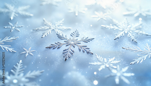 Intricate snowflake patterns on a frosted icy background, delicate and luminous with soft blue and silver tones