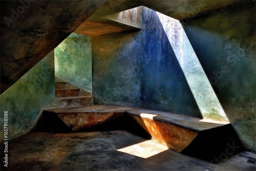 interior, geometric, sunlit, muted, colours, shape, concrete, wall, shadow, architectural, space, design, abstract, textured, light, dark, angle, corner, seating, bench, rustic, vintage, old, rugged, detail, perspective, depth, composition, photo, architecture, spacial, room, gallery, museum, display, contemporary, modern, structure, pattern, texture, tone, hue, shade