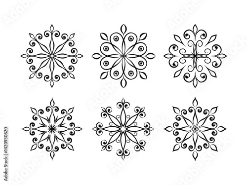 intricate, swirl, flower, element, silhouette, vector, graphic, icon, design, badge, ornament, motif, symbol, isolated, floral, elegant, classical, style, art, fancy, snowflake, snow, pattern, christmas, winter, set, decoration, illustration, star, cold, ice, snowflake, holiday, shape, seamless, crystal