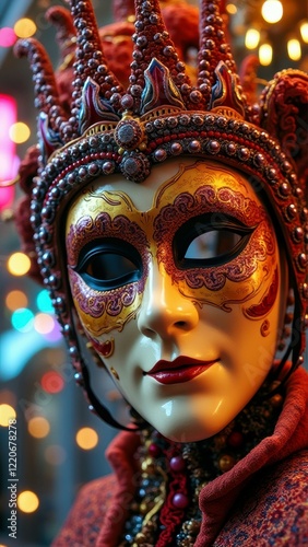 Intricate venetian mask with detailed embellishments and colorful background lights