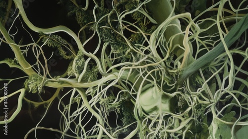 Intricate web of tangled green vines and organic tendrils in shades of olive, mint, and vivid green, interweaving like a chaotic network of nature's growth, blending complexity and beauty