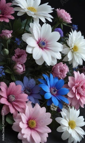 Intriguing and captivating mix of white, pink, and blue flowers on a dark surface, dark, beauty