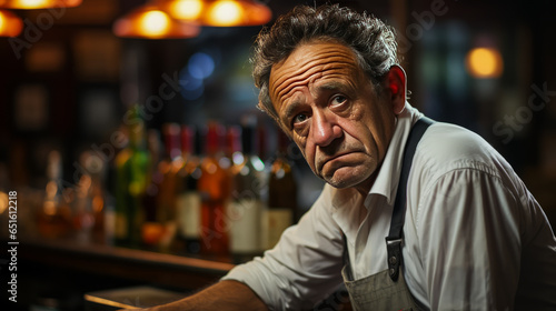 Intriguing regular bar patron, expressing skepticism and suspicion on a bar stool. Emoting doubt and wariness, draws an engaging scene of uncertainty.