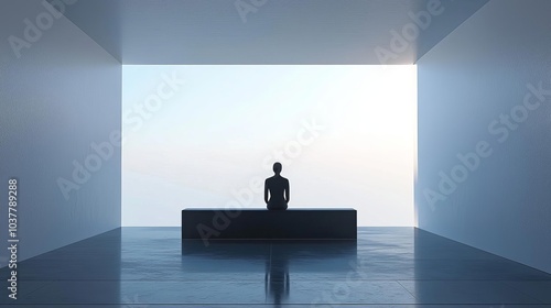 Introvert Solitude Minimalism Isolated figure on a bench, surrounded by open, empty space, introspective solitude, 3D illustration, no face