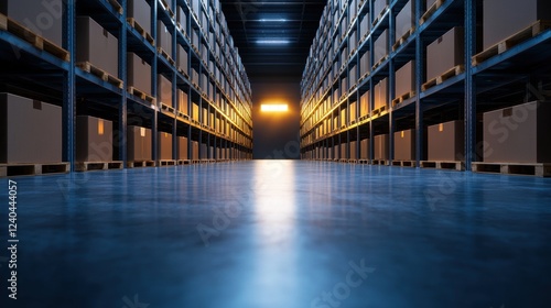 inventory management warehouse Large warehouse interior with high shelves and organized aisles, efficient storage and logistics, modern warehouse operations