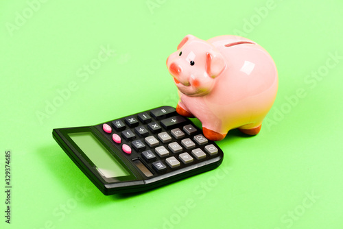 Investing gain profit. Piggy bank pig and calculator. Credit debt concept. Economics and profit management. Economics and finance. Economics and business administration. Piggy bank money savings