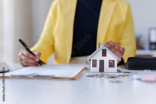 Investing real estate growth. Real estate asset property. Mortgage residential finance. Real estate investment. woman is sitting at a desk with a laptop and a small model of a house.