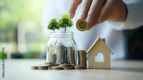 Investment concept with coins, jar, house and small trees.