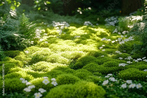 inviting, timberland, scene, carpet, vibrant, moss, gentle, light, filtering, diverse, canopy, softly, enchanting, serene, forest, background, landscape