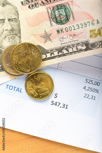 Invoice bill, dollar and euro money banknotes coints on table, accounting concept