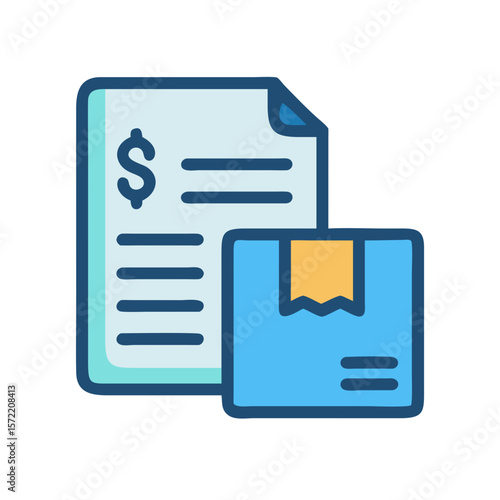 invoice, document, dollar, signs, box, package, shipping, delivery, order, business, finance, vector, icon, illustration, commerce, service, trade, cost, pay, payment, cargo, logistic, mail, postal, blue, turquoise, yellow, price, financial, accounting, product, good, send, isolated, design, symbol, graphic, outline, cartoon, flat