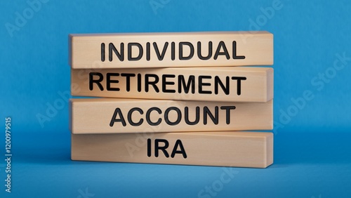 IRA - Individual Retirement Account symbol. Concept word IRA on wooden blocks.Business and IRA concept. Copy space.3D rendering on blue background.
