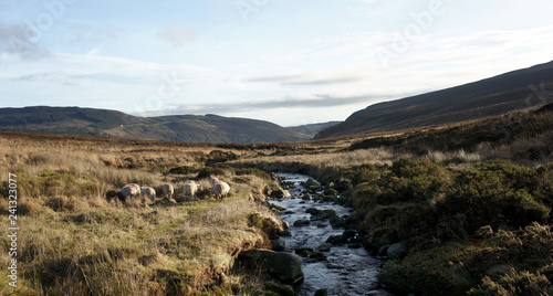 Ireland. A short winter day in the Wicklow Mountains. Sheep graze on the banks of a small mountain river.