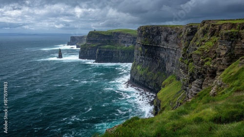 cliff, ocean, coastline, ireland, landscape, sea, wave, rock, formation, nature, travel, scenery, view, shore, erosion, geology, tour tourism, destination, atlantic, cloudy, sky, green, grass, coast, water, environment, scenic, rugged, remote, headland, headland, photo, adventure, exploration, geographical, geologic
