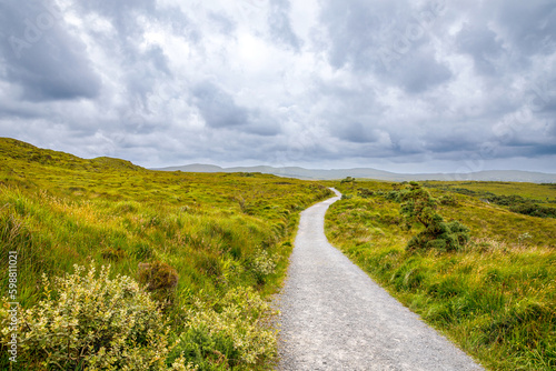Ireland landscape. Magical Irish hills. Green island with sheep and cows on cloudy foggy day. Connemara national park in Ireland.