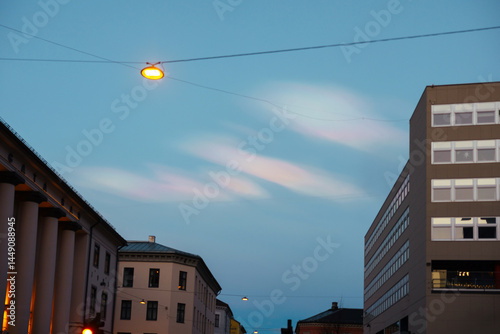 Iridescent Clouds Over City Buildings at Dusk