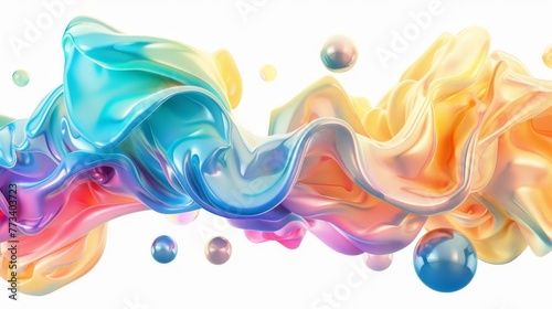 Iridescent fluid shape with floating spheres on white background, abstract 3D illustration