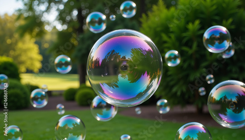 Iridescent soap bubbles floating in garden, whimsical perfection