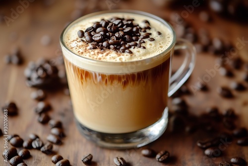 Irish cream coffee decorated with coffee beans on the table .