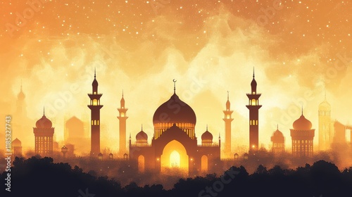 Islamic Ramadan celebration background featuring a glowing lantern, central mosque, and space for your message