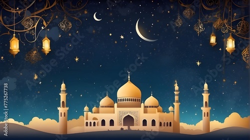 Islamic salutation cards for Eid Mubarak, a Muslim festival The holiday celebration of Eid ul Adha Arabic wallpaper for Ramadan featuring the stars and crescent moon in the night sky