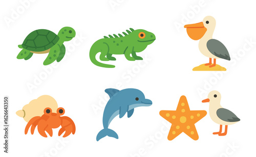 island, animal, grid, flat, vector, mini, illustration, habitat, colours, children, sea, turtle, iguana, hermit, crab, pelican, dolphin, coconut, starfish, seabird, design, designed, all