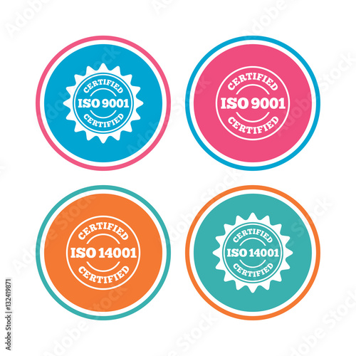 iso, quality, certified, guarantee, certificate, circle, accepted, approved, international, standard, star, stamp, environmental, management, inspecting, eu, european, union, development, icon, signs, buttons, symbol, flat, label, mark, token, shape, information, set, badge, app, vector, round, border, coloured, blue, orange, green, pink, web