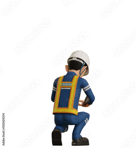 men at work, industrial, industry, operator, construction, mobile, phone, mobile phone, smart, hold, look, check, worked, slide, screen, below, see, ground, floor, down, to sit, heavy duty, engineering, mechanical, labor, engineer, three-dimensional, transparent, white, background, technician, foreman, man, person, back, blue, uniform, shirt, yellow, pose, expression, gesture, helmet, work, vest, visibility, civil, render